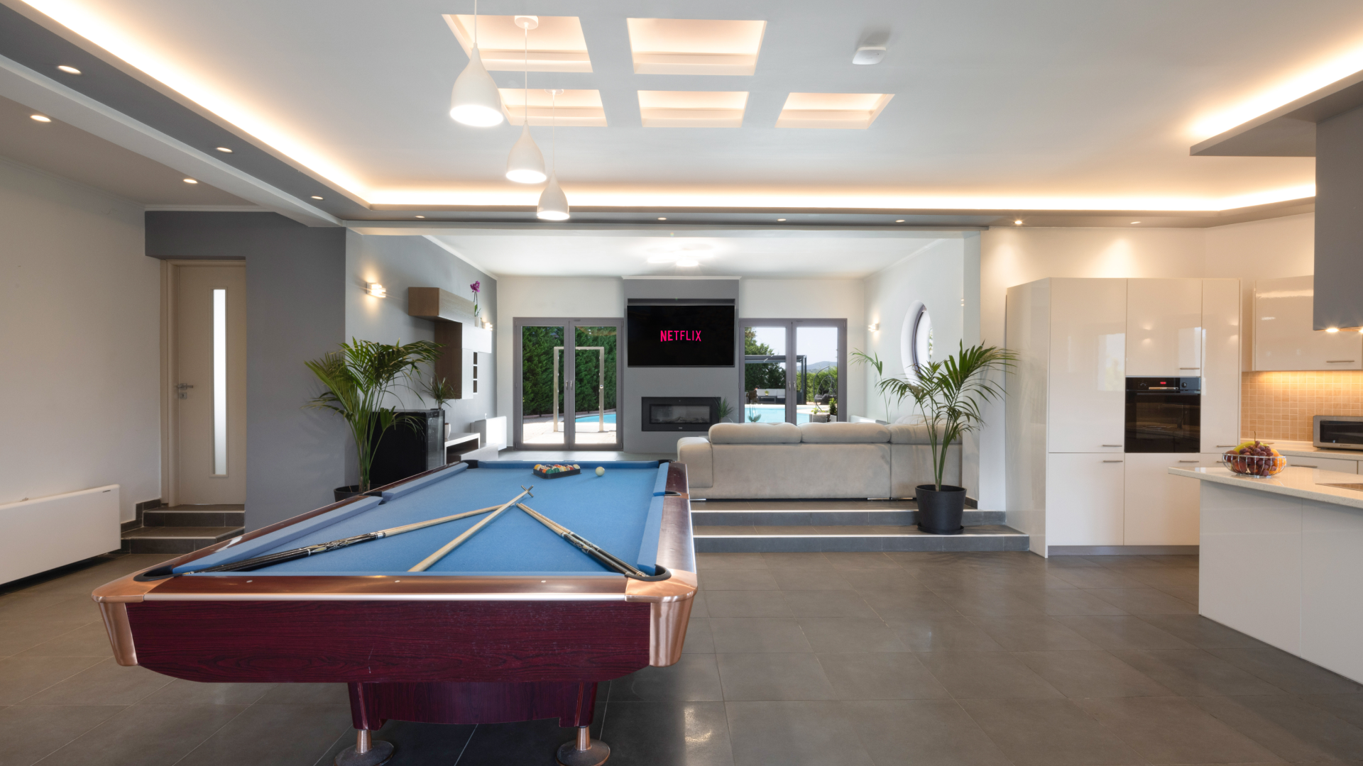 The open-plan living area seamlessly blends a state-of-the-art kitchen, elegant dining space, and a cozy TV lounge, creating a perfect setting for relaxation. Additionally, the first floor includes a "Prince Room," designed to offer luxury and comfort. For entertainment, a billiards table provides endless hours of fun and friendly competition. All areas of this floor also have direct access to the outdoor swimming pool, allowing for easy enjoyment of the sunny outdoors.